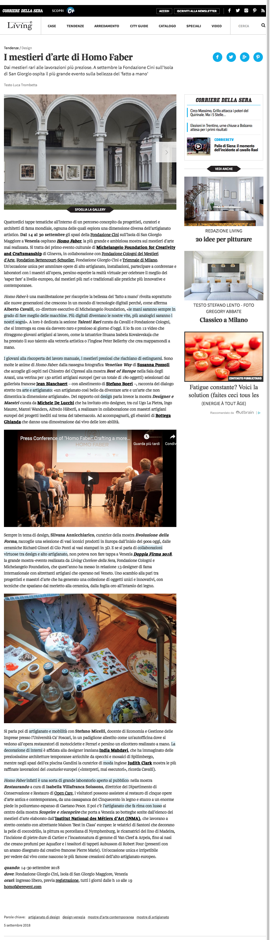I mestieri d’arte di Homo Faber, text by Luca Trombetta, Corriere della Sera / LIVING, Italy