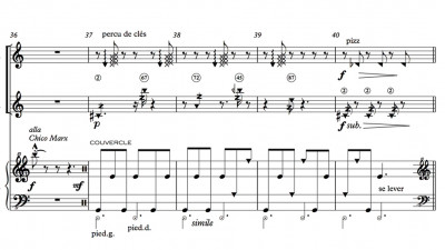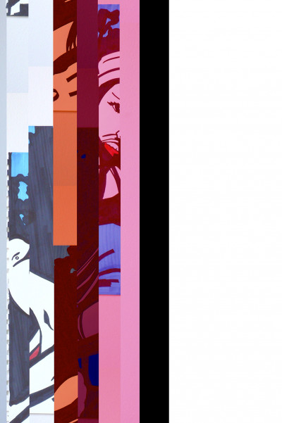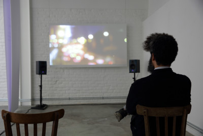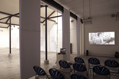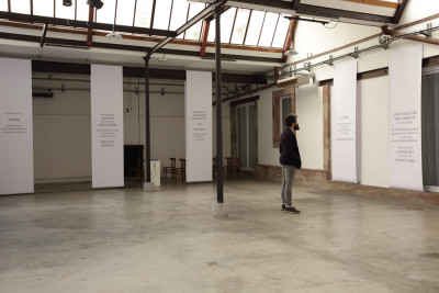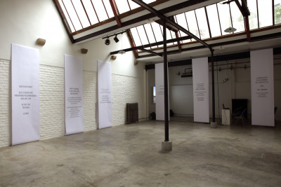 Installation composed of color sound video 35' and wide printed texts
