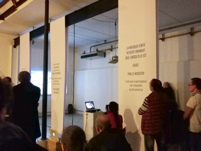 Installation composed of color sound video 35' and wide printed texts